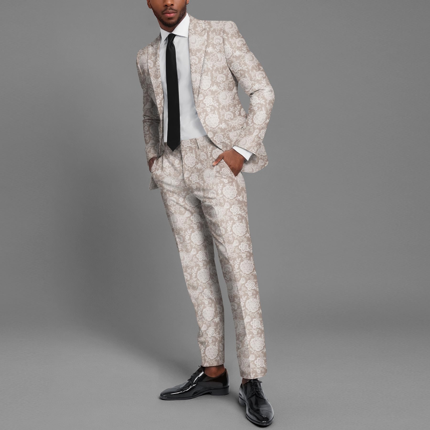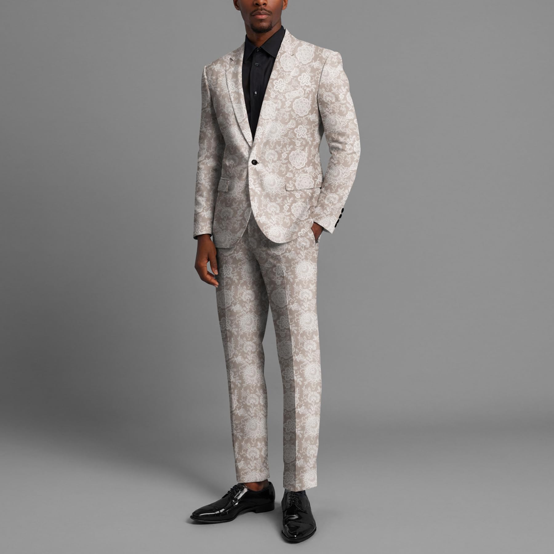 BYBNOLL Men’s Suit 2 Pieces Tuxedo Suit Set Notch Lapel Pattern Printing Jacket Pants for Party Wedding Prom Beige