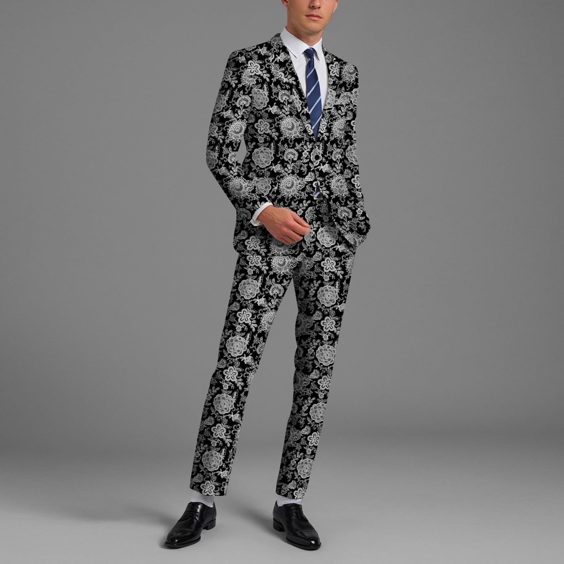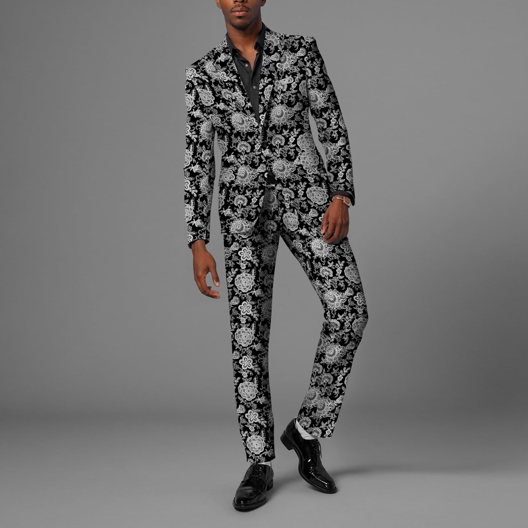 BYBNOLL Men’s Suit 2 Pieces Tuxedo Suit Set Notch Lapel Pattern Printing Jacket Pants for Party Wedding Prom Black Gray