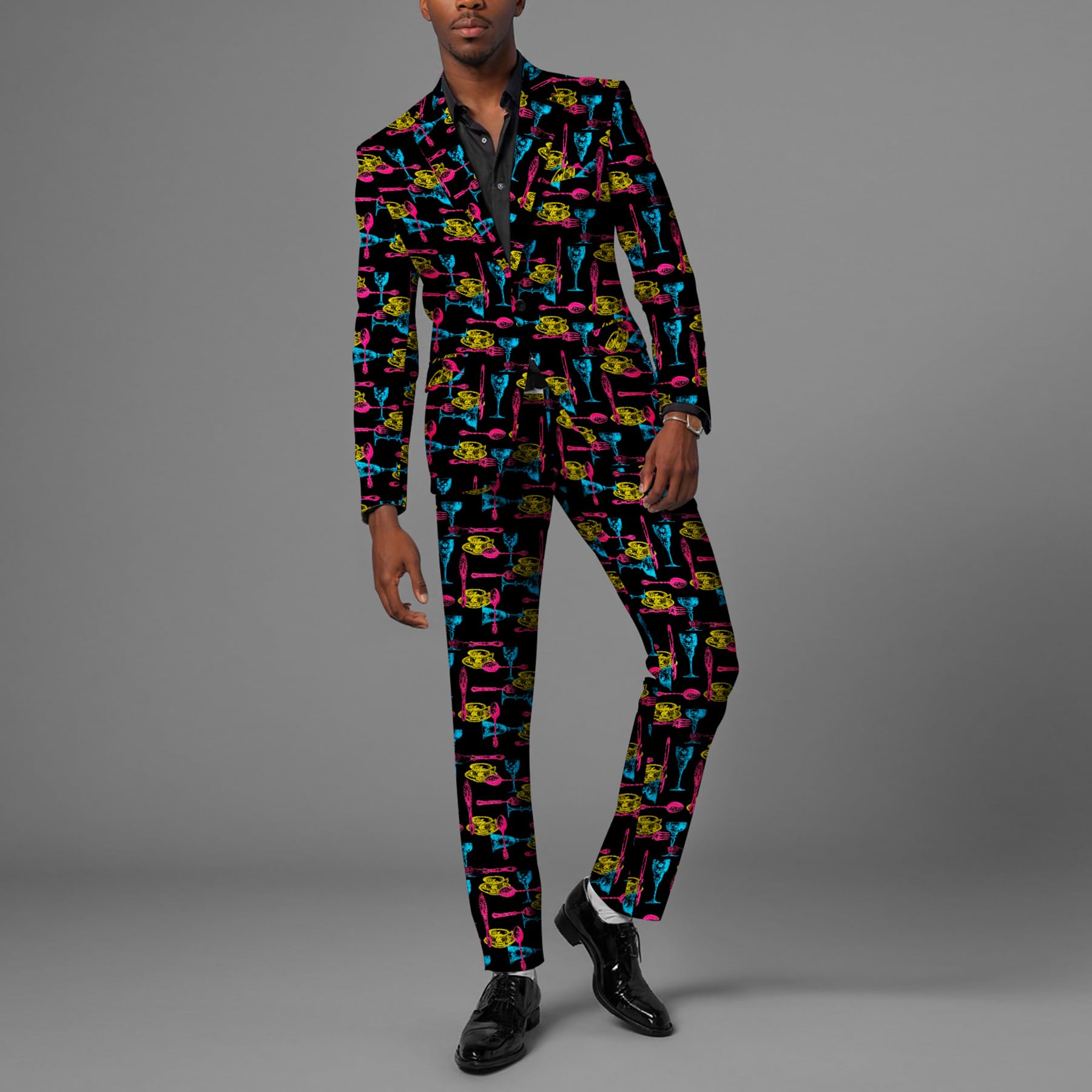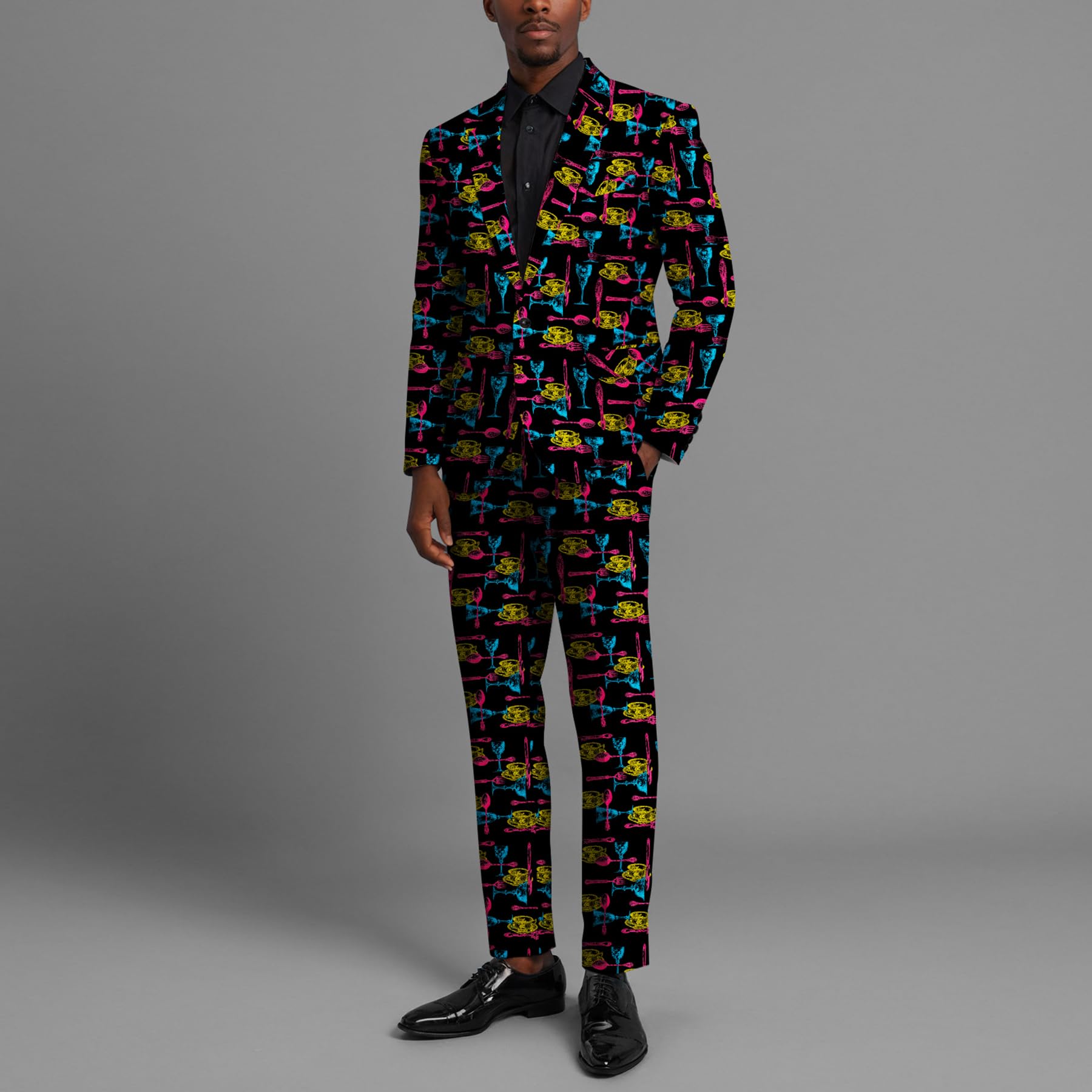 BYBNOLL Men’s Suit 2 Pieces Tuxedo Suit Set Notch Lapel Pattern Printing Jacket Pants for Party Wedding Prom Black Yellow