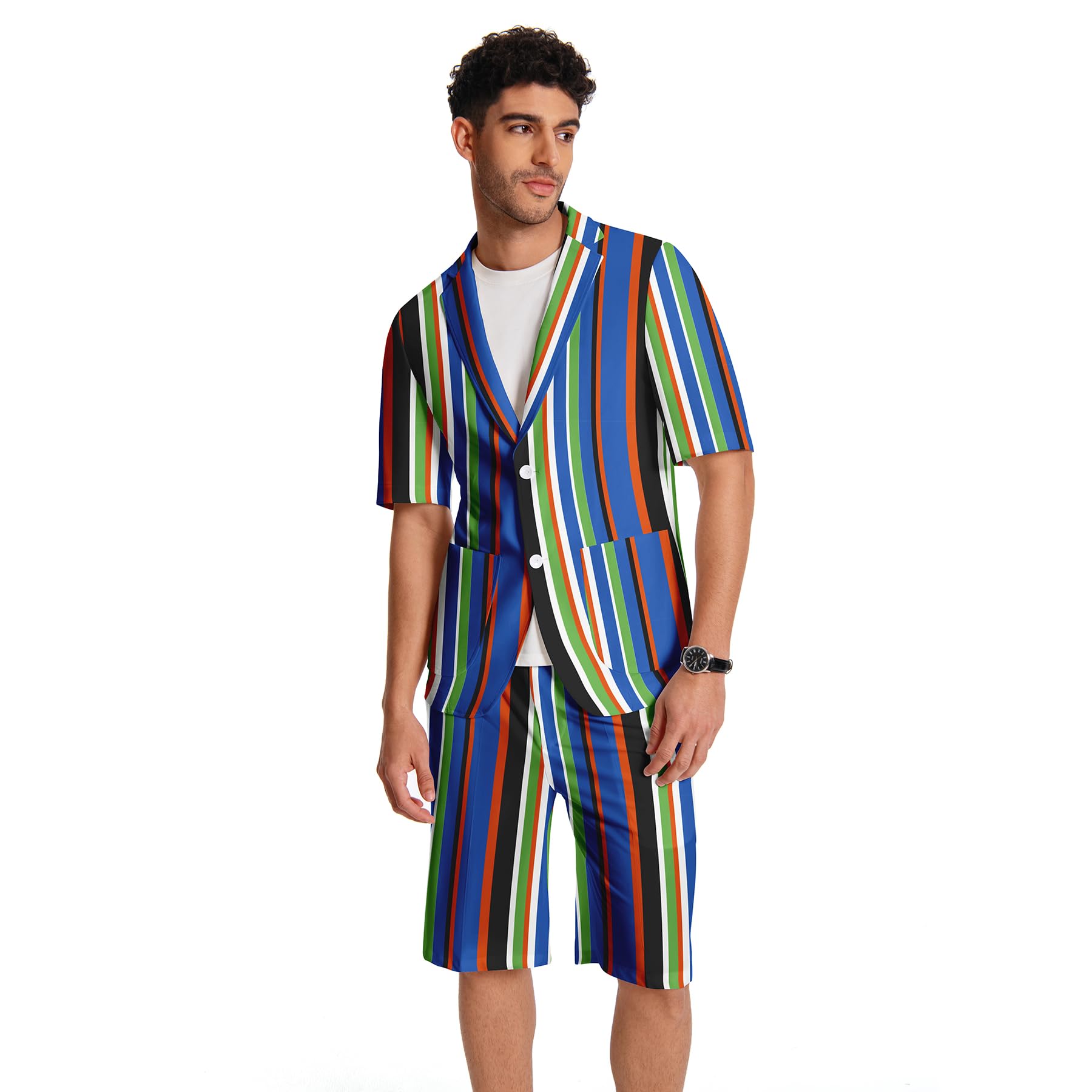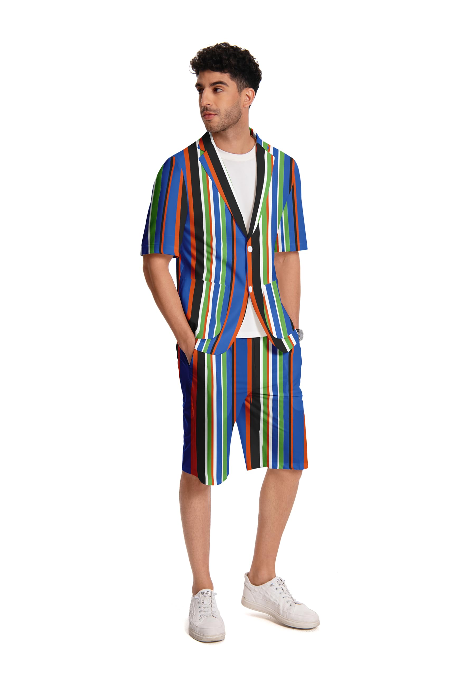 BYBNOLL Men's 2 Piece Suits Printed Short Sleeve Casual Outfit Barge Collar 2 Buttons for Wedding Prom Party Blue Stripe